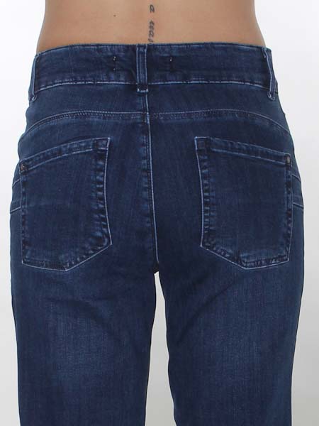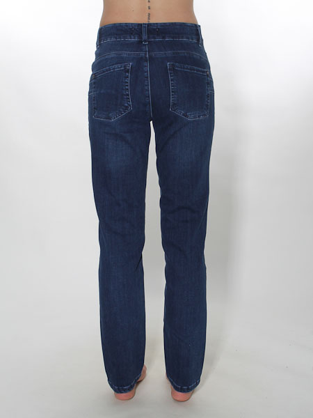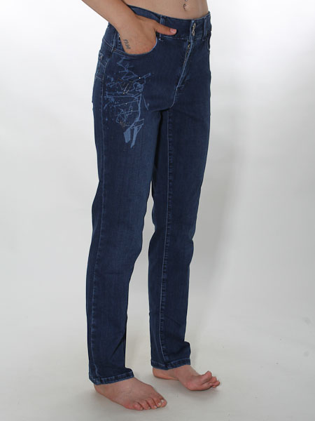 geschnitten ist diese blaue, mid blue, 5-pockets-Jeans von Dolcezza, Kunst und Mode aus Kanada. Sie ist hinten hoch geschnitten, mit 1/2 Saumweite von 18 cm. Das rechte vordere Hosenbein ist jeansblau bedruckt mit Linien, der Druck ist betont mit silbernen aufgebügelten Steinchen. Die Jeans ist lang, innere Beinlänge 77 cm, Länge incl. Bund in Gr. S ca. 104 cm.
