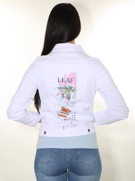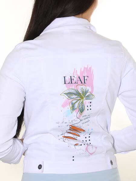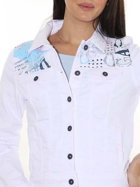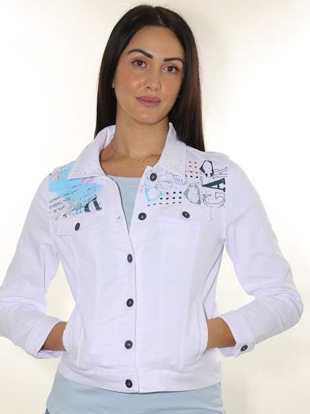 ist die Malerin des Gemäldes, mit dem die vorderen Passen und das Rückenteil dieser weißen Jacke an Vorder- und Rückenteil von Dolcezza bedruckt ist, Kunst und Mode aus Kanada. Die Drucke sind betont mit silbernen aufgebügelten Steinchen und Stickerei am Rückenteil. Die Jacke ist wie eine Jeansjacke geschnitten, mit Kragen, mit Metallknöpfen, mit Brustpatten und kleinen Taschen, mit Manschetten. Auf den Vorderteilen sind 2 senkrechte Pattentaschen. Die schicke Jacke ist gut tailliert. Länge in Gr. S ca. 54 cm. Diese Jacke fällt knapp aus.