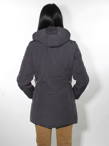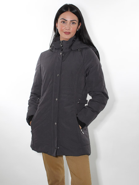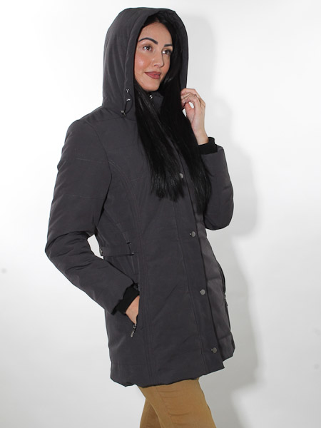 ist diese stahlgraue Jacke von Dolcezza, Kunst und Mode aus Kanada. Sie hat eine große Kapuze, die sie mit einem Reißverschluß abtrennen können. Die Weite der Kapuze läßt sich mit Bändern verstellen. Die lange Jacke wird mit einem Zipper und zusätzlich mit dunkelgrauen Druckknöpfen geschlossen. Auf den Vorderteilen hat sie 2 senkrechte RV-Taschen. In Die Winterjacke ist dick wattiert, das Innenfutter ist uni stahlgrau. In Taillenhöhe ist sie 3 x quer abgesteppt. Die Weite der Taille können Sie mit einem Band und Druckknöpfen verändern. Unter den wattierten Ärmeln hat sie als Abschluß Manschetten aus Rippenjersey. Länge der Winterjacke in Gr. S ca. 86 cm.