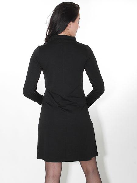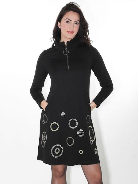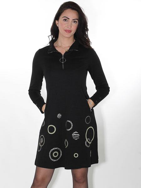 ist das Thema, zu dem dieses Kleid aus einem Baumwolljersey von Dolcezza gehört, Kunst und Mode aus Kanada, wir haben es in der Farbe schwarz mit aufgedruckten Kreisen in limone und goldgelb. Es hat einen hohen Stehkragen, wird mit einem schwarzen Reißverschluß an der vorderen Mitte geschlossen. Es ist tailliert und zum Saum hin ausgestellt. Es hat Taschen in den Seitennähten. Die langen Ärmel haben am Handgelenk senkrecht 2 Druckknöpfe. Länge ca. 99 cm.