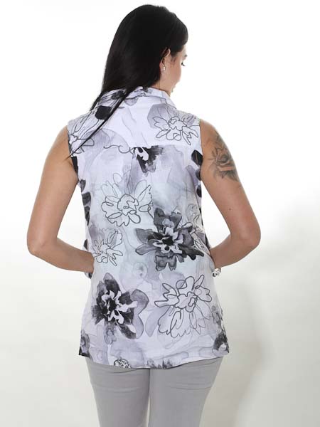 ist die Malerin des Gemäldes, mit dem der Leinenstoff dieser langen Weste von Dolcezza bedruckt ist, Kunst und Mode aus Kanada. Sie hat einen Hemdblusenkragen, wird mit silberfarbenen Knöpfen geschlossen. Sie ist leicht tailliert, zum Saum hin etwas ausgestellt. Sie hat Taschen in den Seitennähten. Länge in Gr. S ca. 78 cm. Die Seitennähte haben kurze Schlitze.