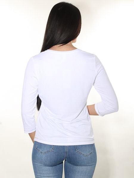 gehört dieses Shirt von Dolcezza, Kunst und Mode aus Kanada. Es hat einen V-Ausschnitt. Der Druck auf dem Vorderteil ist geschmückt mit winzigen silbernen Strasssteinchen. Die Ärmel sind 3/4 lang. Viele Nähte sind betont mit silbernen Kettelnähten. Das Rückenteil ist etwas länger als das Vorderteil. Länge in Gr. S ca. 63 cm vorn und ca. 66 cm hinten.