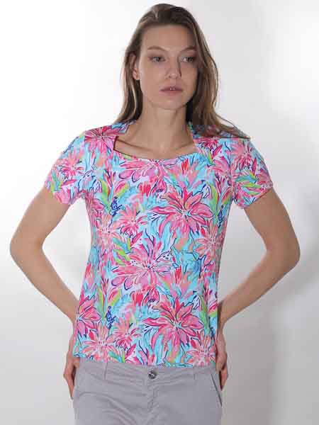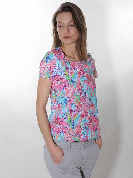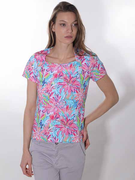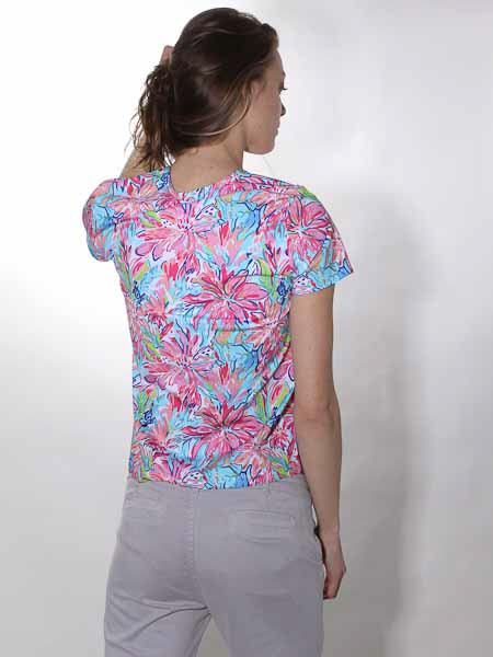 ist die Kunstmalerin des Gemäldes, mit dem der leicht glänzende Jersey dieses Shirts von Dolcezza bedruckt ist, Kunst und Mode aus Kanada. Es hat einen fast quadratischen Ausschnitt. Es ist gut tailliert, die Ärmel sind kurz. Der Jersey ist atmungsaktiv, nimmt Feuchtigkeit auf und trocknet schnell. Dieses Shirt können Sie auch gut zum Sport tragen, beim Laufen, beim Tennis, beim Golf. Länge in Gr. S ca. 61 cm.
