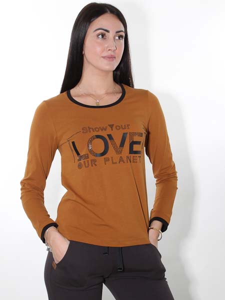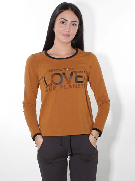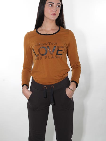 heißt das Thema zu diesem zimtfarbenen Shirt von Dolcezza, Kunst und Mode aus Kanada. Die Schriftzüge sind geformt aus applizierten Stoffstreifen und aufgebügelten schwarzen Ministeinchen, die leicht glänzen. Länge in Gr. S ca. 61 cm.