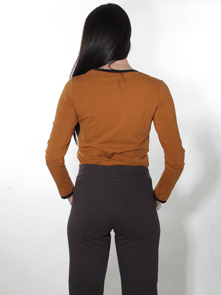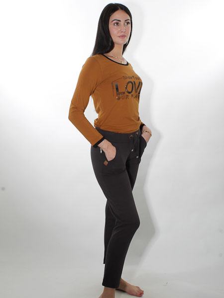 Wir zeigen dazu eine Jogpants in anthrazith mit braunen Details.