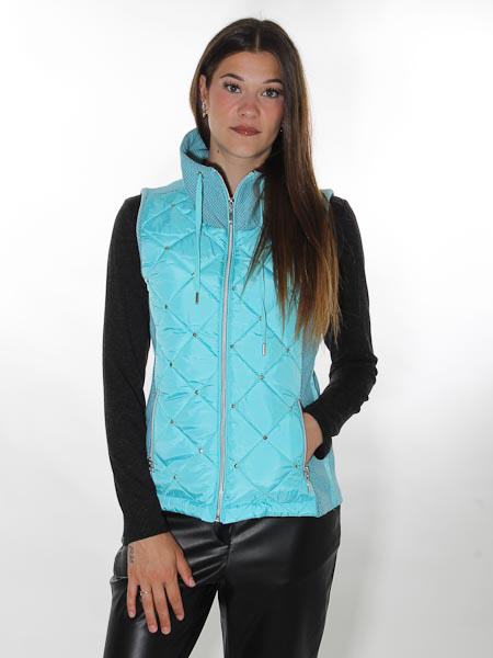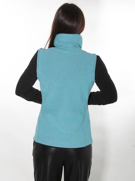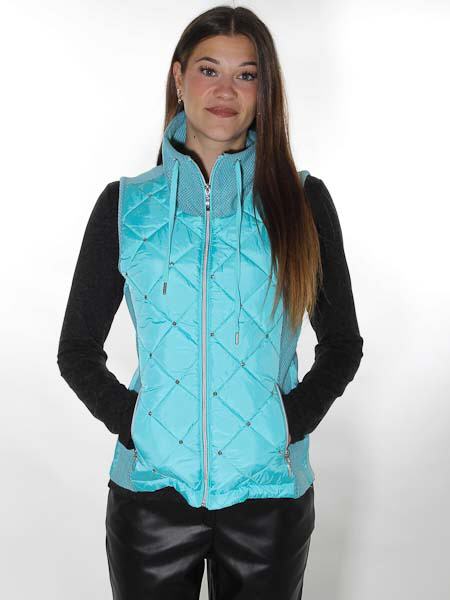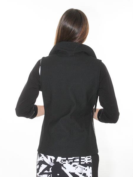 ist das Thema, zu dem diese kurze Weste von Dolcezza gehört, Kunst und Mode aus Kanada. Wir haben sie in schwarz, in der Farbe türkis ist sie ausverkauft. Sie ist aus einem leicht glänzenden Webstoff und 2 strukturierten Strickstoffen gearbeitet, Ton-in-Ton. Die mittleren Partien der Vorderteile sind aus dem Webstoff. Diese Partien snd wattiert und in Rauten abgesteppt, die Rauten sind betont mit silberfarbenen quadratischen Steinchen. Die Weste hat einen hohen Stehkragen, wird mit einem Reißverschluß geschlossen. In den senkrechten Teilungsnähten sind Reißverschlußtaschen eingearbeitet. Die Weste ist leicht tailliert. An den Seitennähten ist ein senkrechter Streifen aus Webstoff. Länge ca. 62 cm.