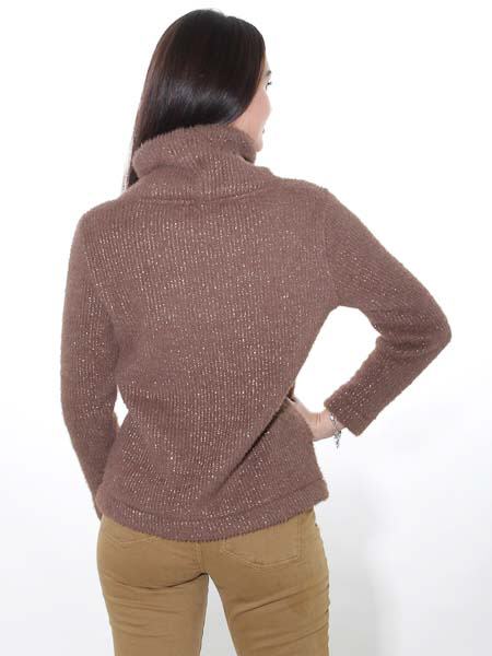 ist dieser Rollkragenpulli von Dolcezza, wir haben ihn in rehbraun, mit einem dezenten Goldlurex. Er ist leicht tailliert. Der Rollkragen ist halsfern. Länge ca. 62 cm.