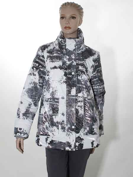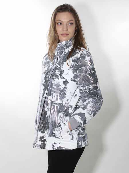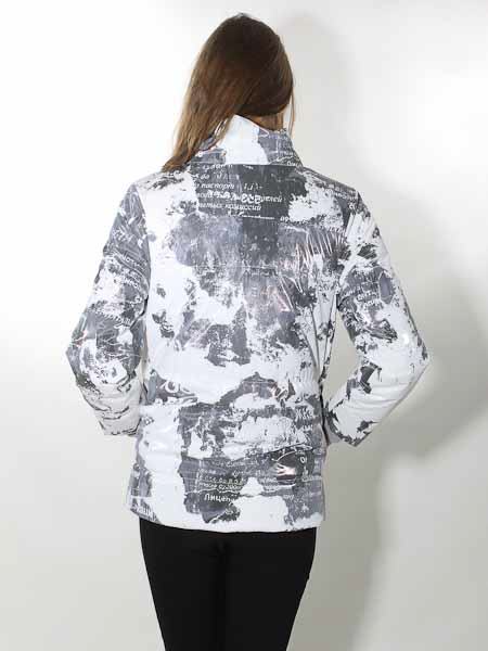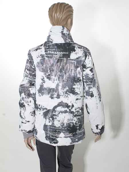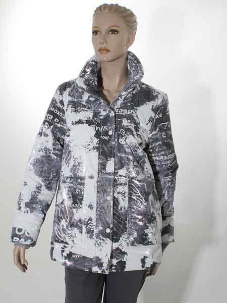ist der Stoff dieser dick wattierten langen Jacke von Dolcezza, Kunst und Mode aus Kanada. Sie wird mit einem Metallzipper und weißen Druckknöpfen geschlossen, ist gerade geschnitten, nicht tailliert. Auf den Vorderteilen hat sie 2 aufgesetzteTaschen. Sie hat einen hohen wattierten Stehkragen. Das Innenfutter ist uni weiß. Die Ärmel haben als Abschluß Bünchen in grau gerippt. Länge der Jacke in Gr. S ca. 72 cm.