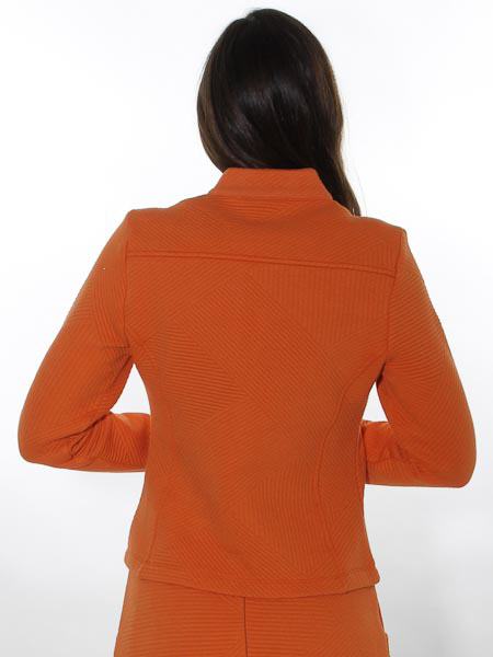 ist das Thema, zu dem diese Jacke von Dolcezza gehört, Kunst und Mode aus Kanada, wir haben sie in der Farbe orange. Sie ist gearbeitet aus einem dicken Strickstoff mit diagonalen Steppungen. Die Jacke hat einen Stehkragen, darunter einen kurzen V-Ausschnitt, wird mit einem schwarzen Reißverschluß geschlossen. Sie hat Pattentaschen auf den Vorderteilen. Die Jacke ist leicht tailiert, fällt relativ knapp aus, entspricht einer Größe 36/38. Länge ca. 55 cm.