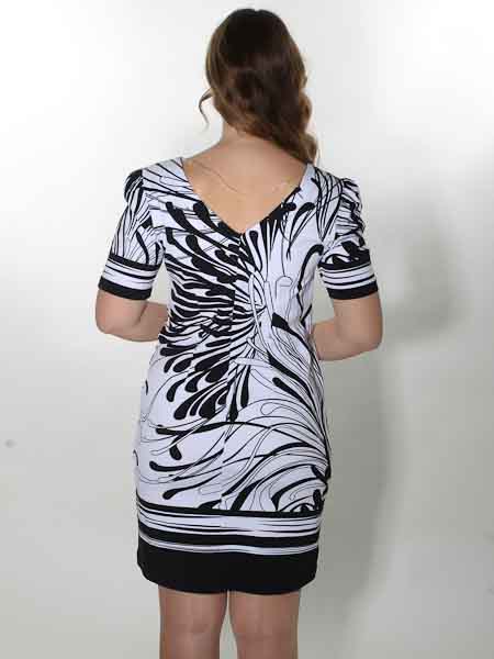 ist das Thema, zu dem dieses Kleid von Dolcezza gehört, Kunst und Mode aus Kanada. Der weiße Jersey ist bedruckt mit schwarzen Linien. Das schicke Kleid hat vorn und hinten einen V-Ausschnitt, an der hinteren Mitte wird es mit Zipper geschlossen. Es ist leicht tailliert, zum Saum hin gerade geschnitten wie ein Etuikleid. Die Ärmel reichen bis zum Ellbogen. Länge in Gr. S ca. 94 cm.