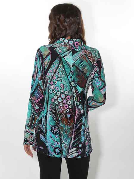 ist die Malerin des Gemäldes, mit dem der Viscosewebstoff dieser langen Bluse von Dolcezza bedruckt ist. Sie hat einen Hemdblusenkragen, ist vorn mit großen quadratischen schwarzen Knöpfen geschlossen bis zur Taille, bis zum Saum hat sie dann eine verdeckte Knopfleiste. Die Bluse ist tailliert, hat an den Seitennähten Schlitze. Die langen Ärmel haben Manschette, die Sie zur Hälfte nach oben schlagen können. Länge in Gr. S ca. 72 cm.