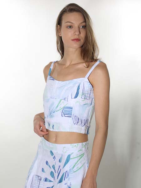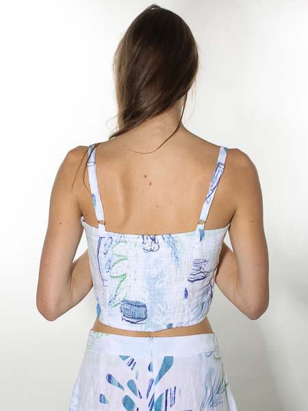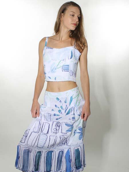 ist die Malerin des Gemäldes, mit dem der Leinenstoff dieses Tops von Dolcezza bedruckt ist, Kunst und Mode aus Kanada. Es hat schmale Träger, in der Länge verstellbar. Es ist tailliert und taillenkurz. Es hat an der linken Seitennaht einen Reißverschluß. Die mittlere Partie des Rückenteils ist gesmokt, das sichert eine perfekte Paßform. Länge in Gr. S ca. 41 cm.