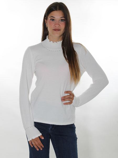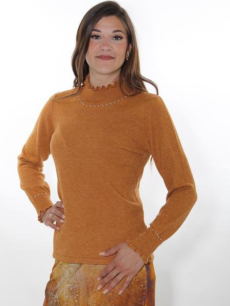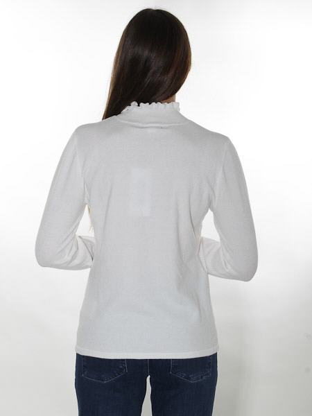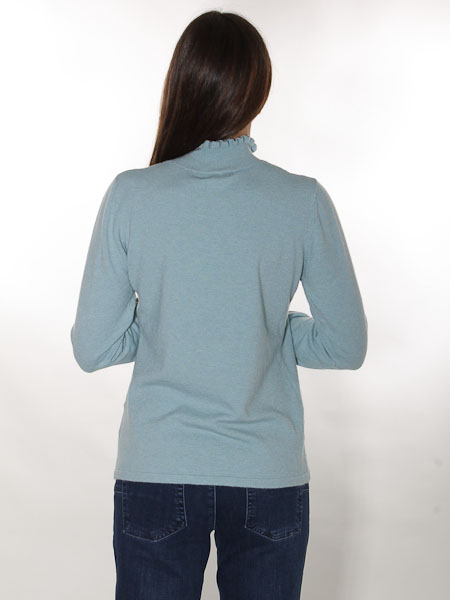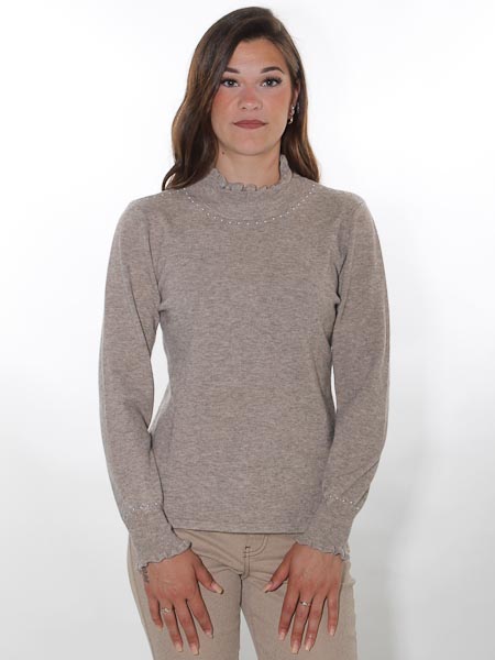 ist das Thema, zu dem dieser kuschelig weiche Pulli von Dolcezza gehört, Kunst und Mode aus Kanada. Wir haben ihn in sand, schwarz, kirschrot, wollweiß, hellblau und in curry. Er hat einen hohen Stehkragen, die Abschlüsse an Stehkragen und Ärmeln sind im Rippenmuster und dann mit kleiner Rüsche gestrickt. Der Pulli ist leicht tailliert. Die Schulternaht, der vodere Halsausschnitt und die Ärmelrippenabschlüsse sind betont mit kleinen silbernen Steinchen. Länge ca. 60 cm.