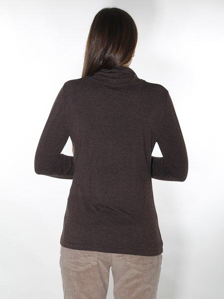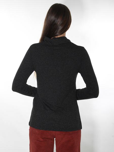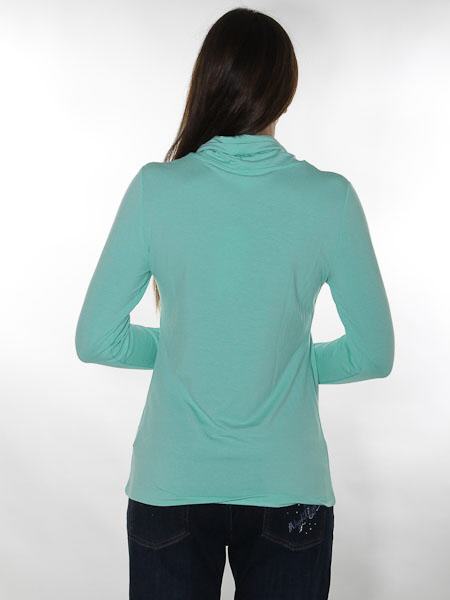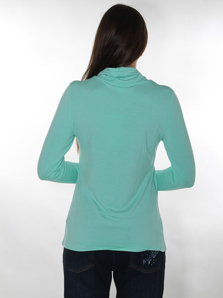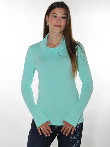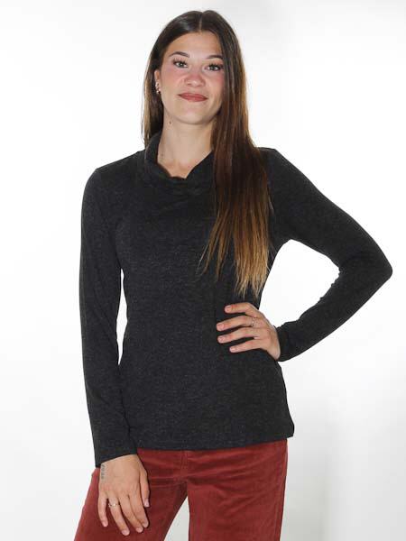 haben wir dieses Shirt von Dolcezza. Es hat einen halsfernen, weich fallenden Rollkragen, ist leicht tailliert, hat lange Ärmel. Länge in Gr. S ca. 64 cm.
