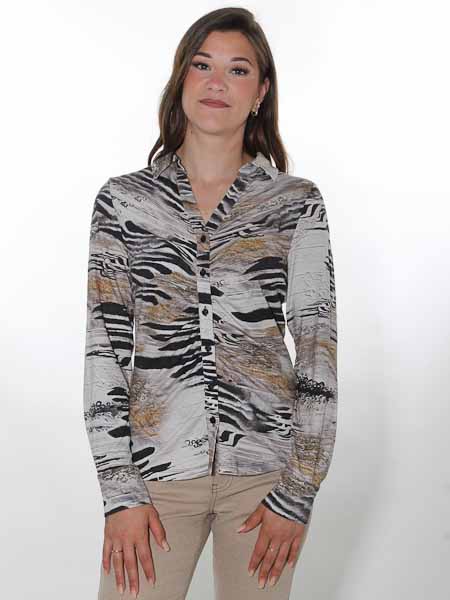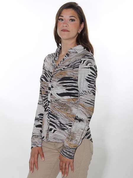ist die Kunstmalerin des Gemäldes, mit dem der Jersey dieser Shirtbluse von Dolcezza bedruckt ist. Sie hat einen Hemdblusenkragen, darunter einen kurzen V-Ausschnitt, dann ist sie durchgeknöpft mit dunkelbraunen Knöpfchen Das Shirt ist leicht tailliert. Die langen Ärmel haben Manschetten mit 2 Knöpfchen. Die Saumkanten sind gerundet. Länge in Gr. S ca. 64 cm.