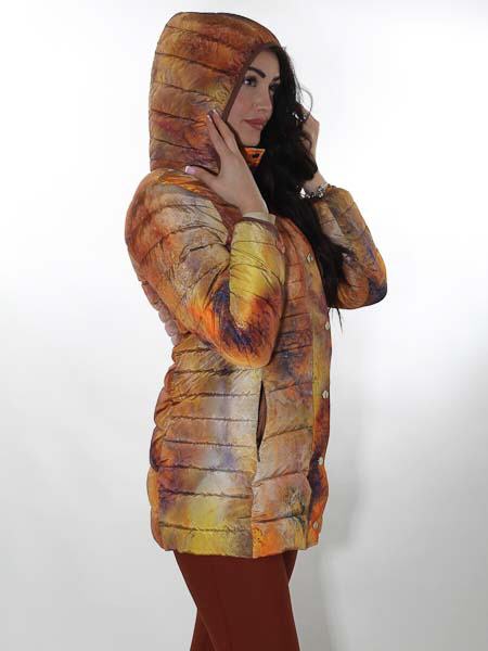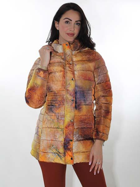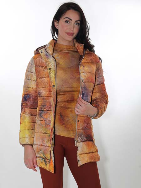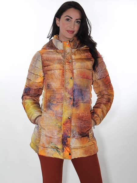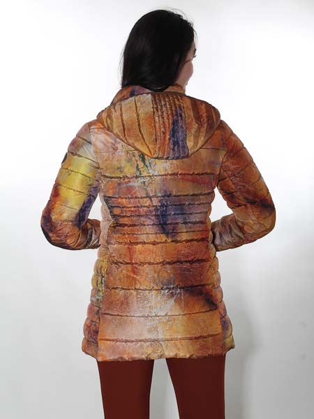 ist die Malerin des Gemäldes, mit dem der Webstoff dieser langen Steppjacke von Dolcezza bedruckt ist. Sie ist wattiert und waagrecht abgesteppt. Sie hat einen wattierten Stehkragen. Die Kapuze ist wattiert, innen rehbraun und mit einem Zipper abtrennbar. Die Steppjacke wird mit einem goldenen Zipper verdeckt geschlossen und zusätzlich mit goldenen Druckknöpfen. Sie hat an den Vorderteilen 2 Reißverschlußtaschen in den senkrechten Teilungsnähten. Die Jacke ist leicht tailliert, ist rehbraun gefüttert. Die langen Ärmel und die Kapuze haben als Abschluß einen schmalen braunen Gummibund. Länge in Gr. S ca. 81 cm.