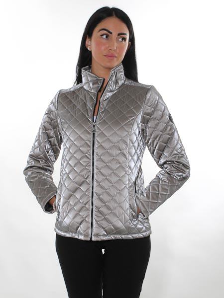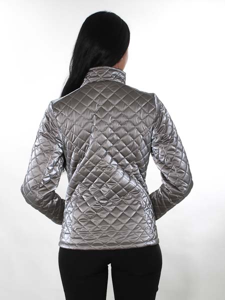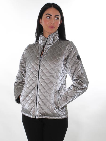 ist der taupefarbene Stoff bei dieser Steppjacke von Dolcezza. Sie ist wattiert, diagonal in Rauten abgesteppt. Sie hat einen wattierten Stehkragen. Die Jacke wird mit einem schwarzen Zipper geschlossen. Die Jacke hat 2 Taschen mit Zipper. Sie ist leicht tailliert, schwarz gefüttert. Länge in Gr. S ca. 68 cm.