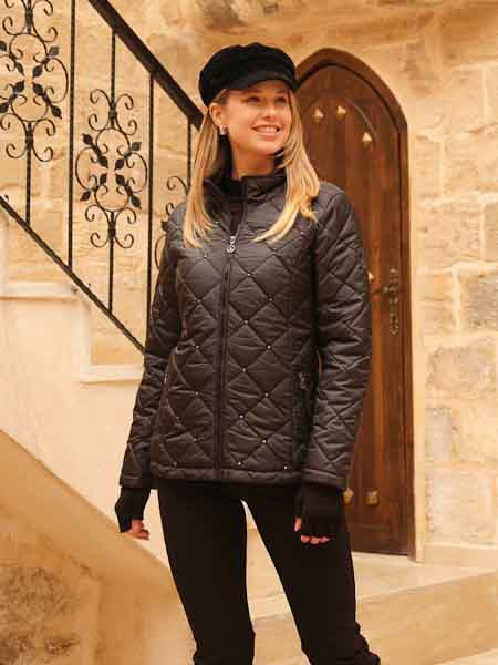 haben wir diese Steppjacke von Dolcezza. Sie ist wattiert und in Rauten abgesteppt. Sie hat einen Stehkragen, der mit schwarzem Rippenstrickstoff gefüttert ist. Die Steppjacke wird mit einem schwarzen Zipper geschlossen. Sie hat an den Vorderteil 2 Reißverschlußtaschen. An den Seitennähten hat sie einen senkrechten Streifen aus schwarzem Rippenstrickstoff. Die Jacke ist leicht tailliert, ist schwarz gefüttert. Länge in Gr. S ca. 66 cm.