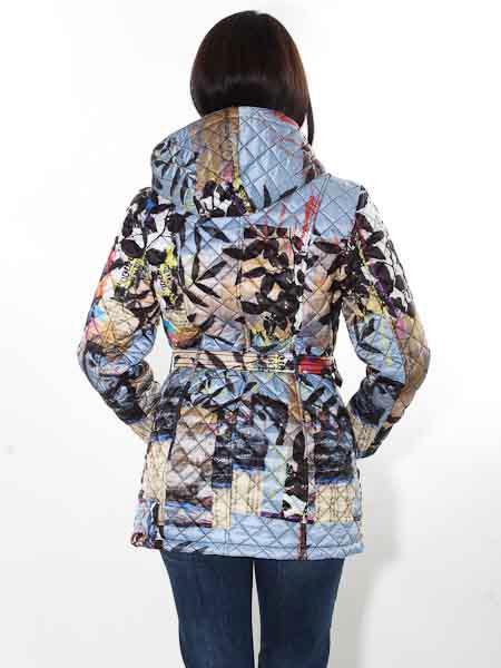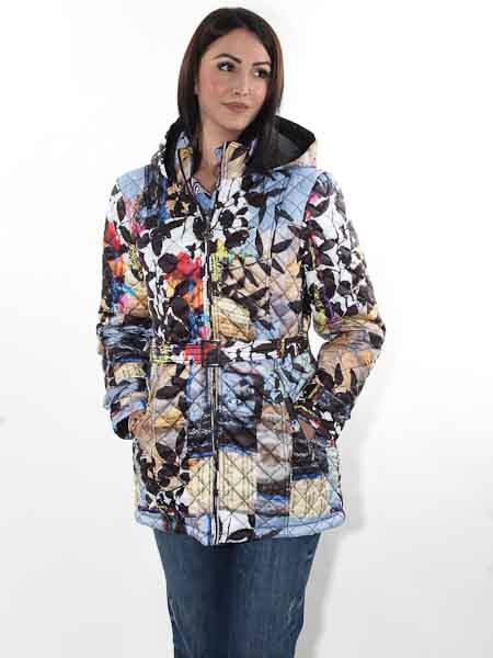 ist die Malerin des Gemäldes, mit dem der Stoff dieser langen Steppjacke von Dolcezza, Kunst und Mode aus Kanada, bedruckt ist. Sie wird mit einem Metallzipper geschlossen. Auf den Vorderteilen hat sie 2 RV-Taschen. Sie hat einen Stehkragen und eine Kapuze. Sie ist wattiert und gesteppt, das Innenfutter ist uni schwarz. Sie hat einen Gürtel mit Metallverschluß. Länge der Steppjacke in Gr. S ca. 80 cm.