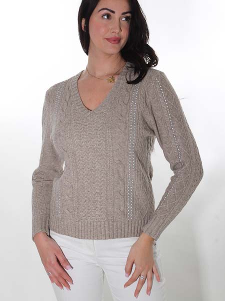 ist das Thema, zu dem dieser sandfarbene kuschelig weiche Pulli von Dolcezza gehört, Kunst und Mode aus Kanada. Er hat einen V-Ausschnitt, alle Abschlüsse sind im Rippenmuster gestrickt. Er ist im Mustermix gestrickt, mit verschiedenen Zopfmustern. Er ist gerade geschnitten. Einige senkrechten Flächen sind betont mit verschieden großen silbernen Steinchen. Länge ca. 63 cm.