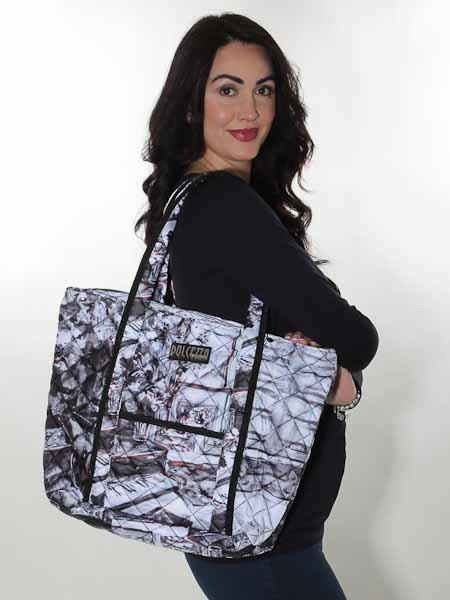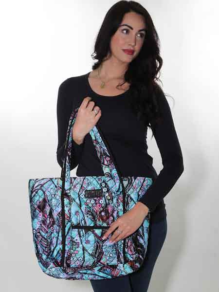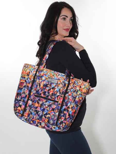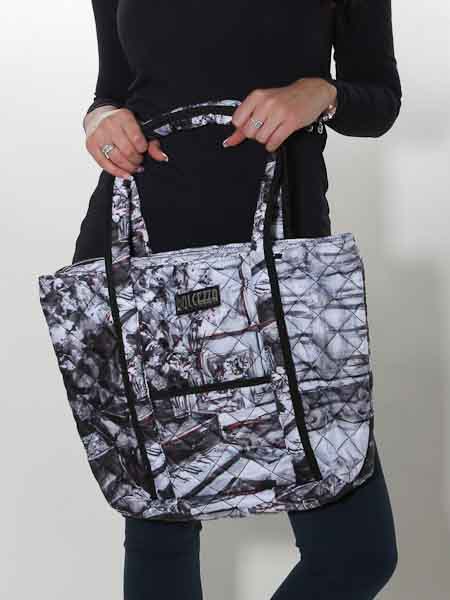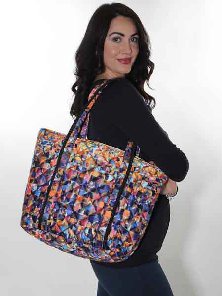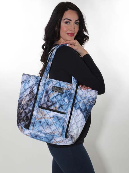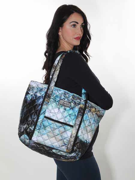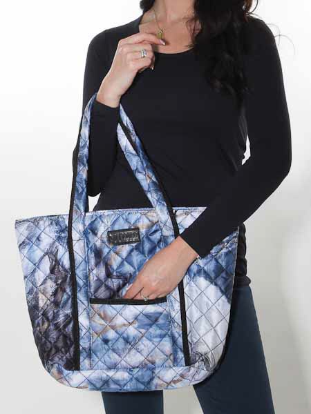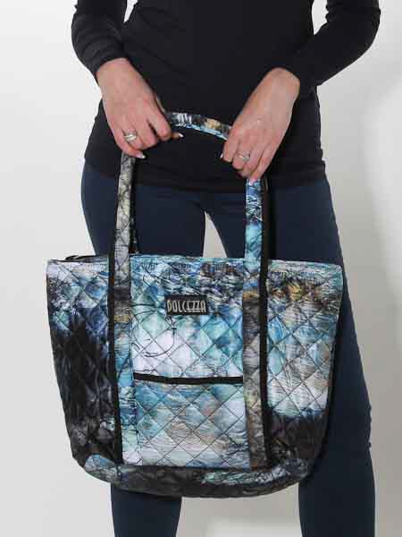 mit einem Gemälde ist der waschbare Polyesterstoff dieser großen Shopping-Taschen von Dolcezza, Kunst und Mode aus Kanada. Der Stoff ist in kleinen Rauten wattiert und abgesteppt. Die Tasche ist rechteckig, wird oben mit einem Metall-Reißverschluß geschlossen. Sie hat aussen eine aufgesetzte Tasche. Auch die Träger sind wattiert und mit schwarzem Ripsband verstärkt. Innen ist sie schwarz gefüttert, hat eine zusätzliche RV-Tasche. Höhe ca. 35 cm, Breite ca. 45 cm, Tiefe ca. 10 cm. Höhe incl. Träger ca. 59 cm.