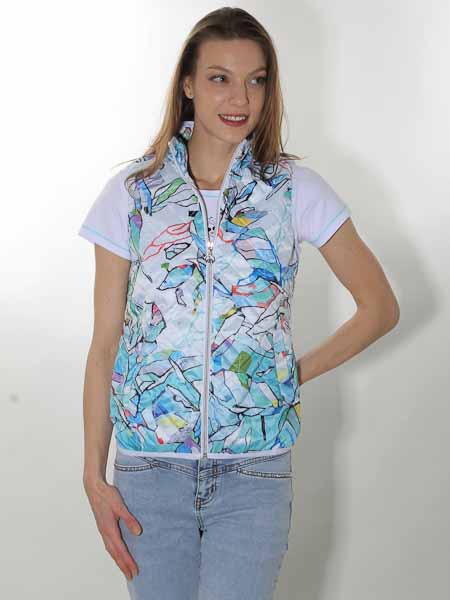 ist die Kunstmalerin des Gemäldes, mit dem der Webstoff dieser Steppweste von Dolcezza bedruckt ist, Kunst und Mode aus Kanada. Sie hat einen Stehkragen, wird vorn mit silbernem Zipper geschlossen. Die Weste ist gefüttert mit weißem Futterstoff. Die Armausschnitt- und Saumkanten sind uni weiß und leicht elastisch. Auf den Vorderteilen sind 2 Pattentaschen. Länge in Gr. S ca. 63 cm.