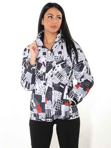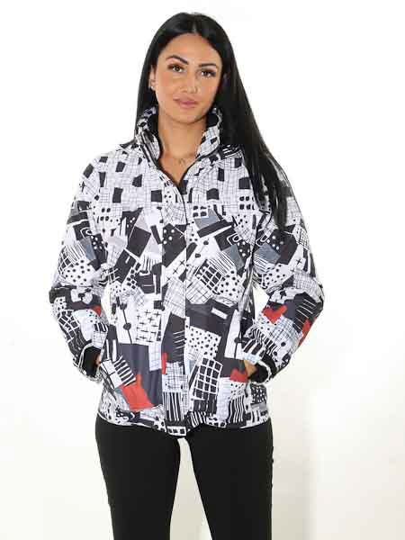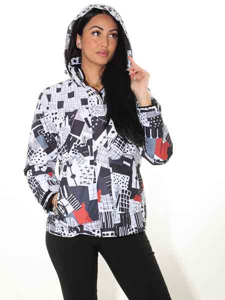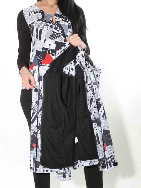ist die Malerin des Gemäldes, mit dem der Stoff bei dieser Outdoorjacke von Dolcezza bedruckt ist, Kunst und Mode aus Kanada. Sie hat einen hohen Stehkragen, wird mit einem Reißverschluß geschlossen. Sie hat Reißverschlußtaschen in den senkrechten Teilungsnähten. Sie ist schwarz gefüttert. Die Weite der Kapuze können Sie mit Bändern verändern. Die Weite am Saum können Sie innen mit Bändern variieren. Die Ärmel haben am Handgelenk Klettbänder, mit denen Sie die Weite variieren können. Die Jacke ist doppelt gearbeitet, 2 in 1. Sie hat innen eine Fleecejacke, die Sie mit Reißverschlüssen heraustrennen können. So können Sie die Outdoorjacke auch an wärmeren Tagen tragen. Die Fleecejacke können Sie auch getrennt von der Outdoorjacke tragen. Länge in Gr. S ca. 69 cm.