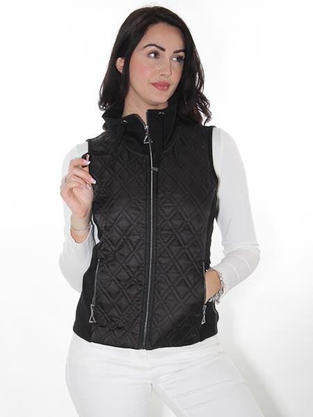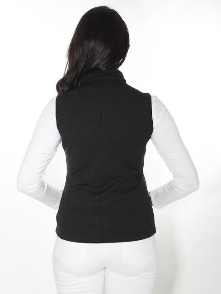 ist das Thema, zu dem diese kurze Weste von Dolcezza gehört, Kunst und Mode aus Kanada, Sie ist aus 2 verschiedenen Materialien gearbeitet, einem schwarzen Webstoff und einem dickeren schwarzen Jersey. Die mittleren Partien der Vorderteile sind aus schwarzem Webstoff. Diese Partien snd wattiert und in Rauten abgesteppt. Die Weste hat einen hohen Stehkragen, wird mit einem schwarzen Reißverschluß geschlossen. In den Teilungsnähten sind Reißverschlußtaschen eingearbeitet. Die Weste ist leicht tailiert. An den Seitennähten ist ein senkrechter Streifen aus schwarzem Webstoff. Länge ca. 62 cm.
