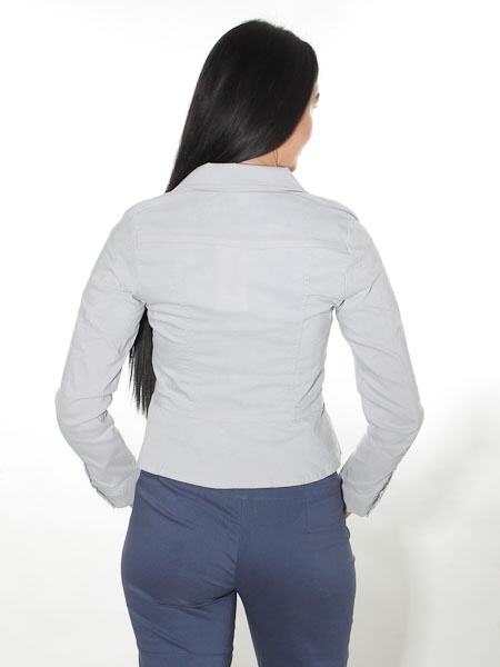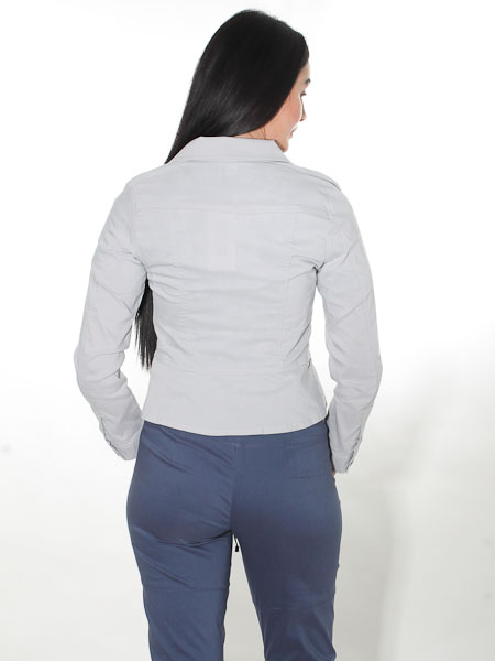ist das Thema, zu dem diese kurze Jacke aus einem leichten Stretchstoff von Dolcezza gehört, Kunst und Mode aus Kanada. Wir haben sie in der Farbe silbergrau. Sie hat einen Kragen, wird mit Metallknöpfen geschlossen. Sie ist gut tailliert, zum Saum hin ausgestellt, wie ein Schößchen. Sie hat 2 Brusttaschen mit Patten und Metallknöpfen. Die langen Ärmel haben Manschetten. Länge ca. 53 cm. Die Jacke fällt recht klein aus.