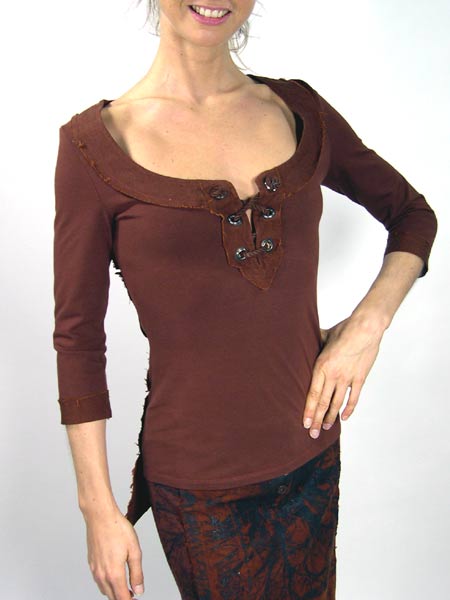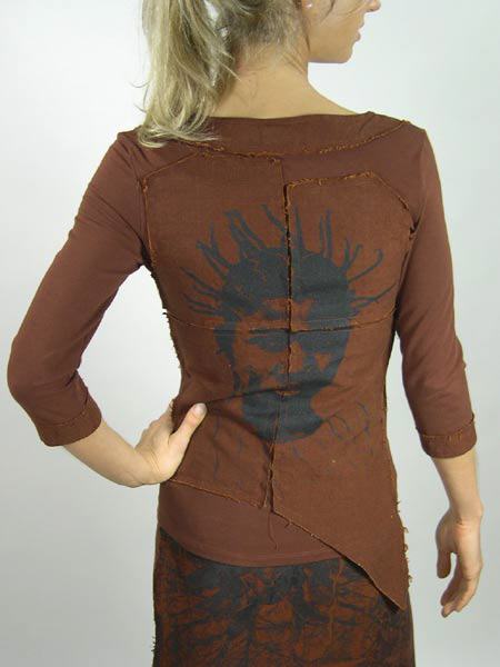 Afrikanische Muster und afrikanische Farben hat dieses Shirt von Isabel de Pedro, zusammengesetzt aus Leinen und Shirtstoff, das Leinen mit offenen Stoffkanten, am Rücken sind beide Stoffe nachträglich überdruckt mit einem afrikanischen Motiv.