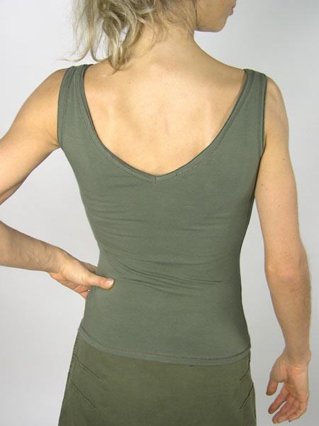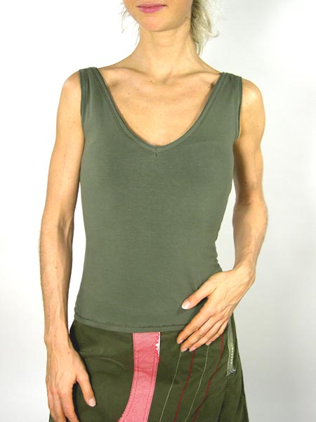 Kahkifarbiges Top von Isabel de Pedro, mit doppelten, geschnittenen Kanten an Arm- und V-Ausschnitten. Es paßt z. B. zum Rock von OHDD in kahki/rot.
