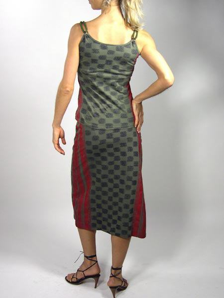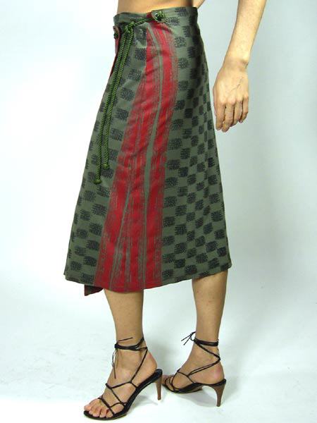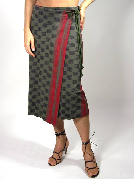 Wickelrock von Isabel de Pedro in kahki/rot zum Trendthema Afrika, der Rock wird innen mit Knopf und seitlich mit geknoteten Kordeln geschlossen. Länge des Rockes ca. 74 cm.