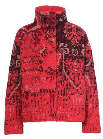 ist die Grundfarbe dieser etwas dickeren grob gestrickten Strickjacke von Ivko, herrlich warm. Sie ist im Jacquardmuster im Mustermix mit Motiven und Ornamenten im Thema Kilim Pattern Kelimmuster gestrickt mit den Farben schwarzbraun, altrosa und weinrot. Sie hat überschnittene Schultern, ist oversized und kastig geschnitten. Die Jacke wird mit großen korallroten Knöpfen geschlossen. Die Strickjacke hat einen runden Halsausschnitt mit hohem Stehkragen, der Stehkragen und die Knopfleiste innen sind uni korallrot. Sie hat 2 Pattentaschen auf den Vorderteilen. Länge ca. 61 cm in Größe 38.