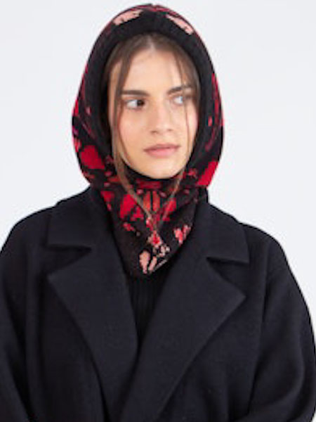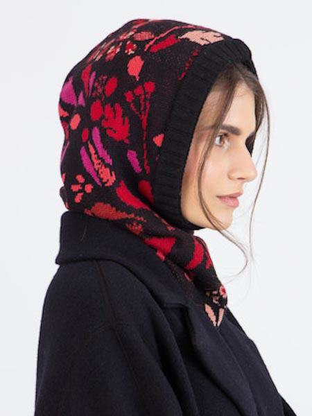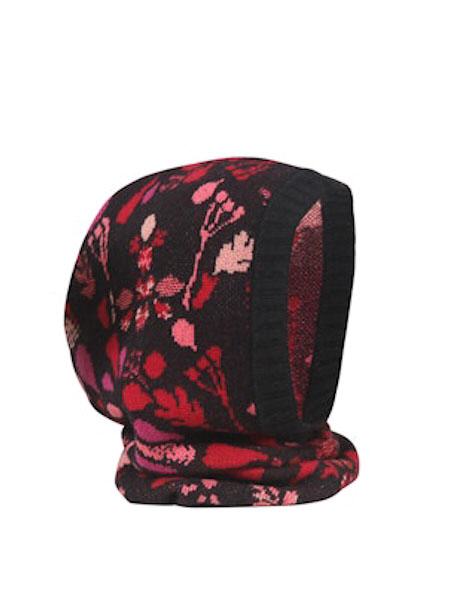 Wir haben diese Kapuzenmütze von Ivko in der Farbe 089 chocolate black, schwarzbraun mit den Farben rot pink rosa apricot rost. Indoor können Sie die Kapuzenmütze auch wie einen Loop tragen. Die Mischung aus Wolle, Viscose, Nylon und ein wenig Wolle von der Kaschmirziege ist herrlich weich und wärmend. Die Kanten sind uni in schwarzbraun im Rippenmuster gestrickt.
