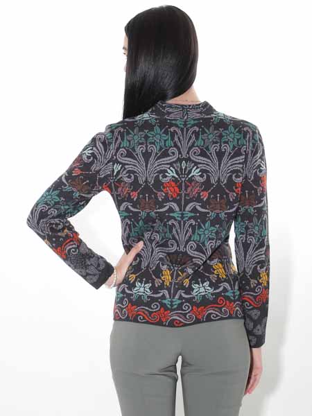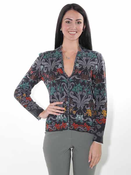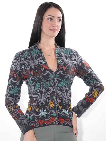 ist die Grundfarbe dieser schönen Strickjacke von Ivko, im Mustermix mit Blumen Mustern und Ornamenten in den Farben grau grün rost braun mint und senfgelb. Sie hat einen V-Ausschnitt und einen angeschnittenen Kragen, schön warm am Hals. Sie ist durchgeknöpft mit kleinen Knöpfen. Sie ist leicht tailliert. Die Blenden am Kragen, am V-Ausschnitt und an den Knopfleisten sind im Bordürenmuster gestrickt.