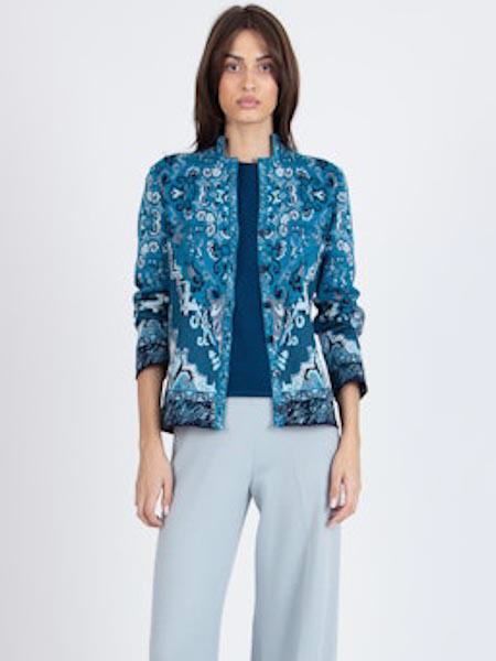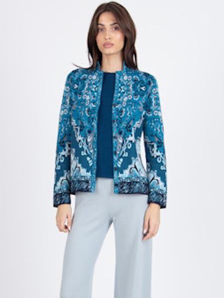 ist die Grundfarbe dieser schönen Strickjacke von Ivko, im Jacquardmuster im Kelimmuster Teppichmuster mit den Farben petrol türkis mint wollweiß. Sie hat einen runden Halsausschnitt, einen kleinen Kragen, sehr angenehm am Hals, darunter einen kurzen V-Ausschnitt. Sie wird geschlossen mit kleinen dunkelblauen Knöpfen. Sie ist leicht tailliert. Die Saumkanten der langen Ärmel und der Vorderteile und des Rückenteils sind im Bordürenmuster gestrickt. Die Länge ca. 62 cm in Größe 38.