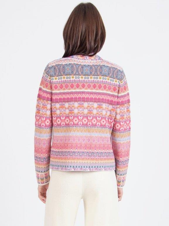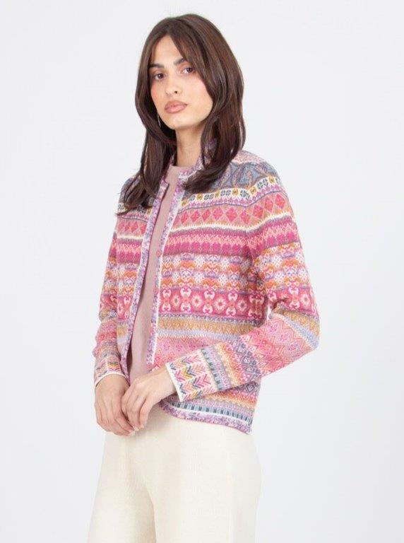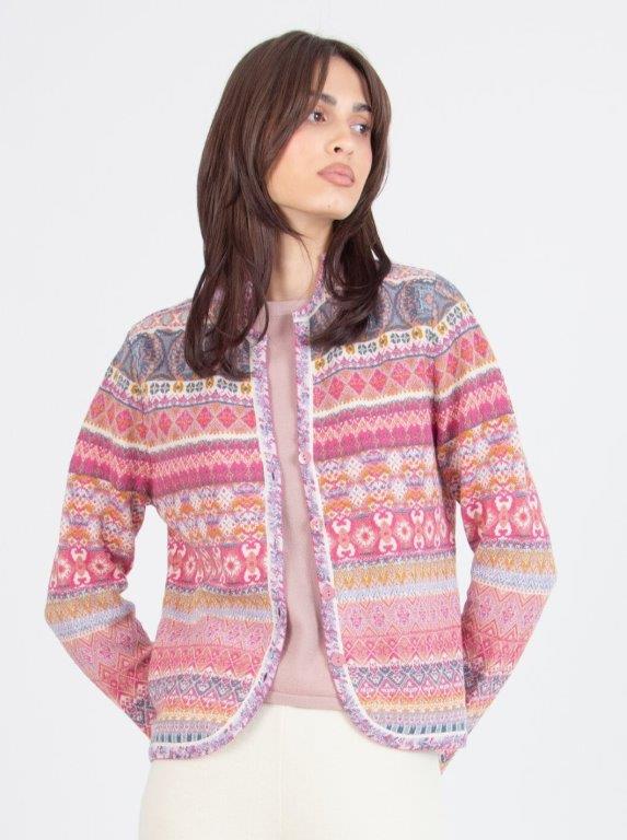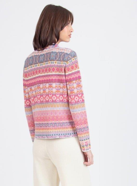 ist die Grundfarbe dieser schönen Strickjacke von Ivko im Jacquardmuster mit grafischen Mustern und Ornamenten zum Thema Re-Dandy mit den Farben wollweiß, rosa, graublau, flieder und zimt. Sie hat einen runden Halsausschnitt, einen kleinen Kragen. Sie wird geschlossen mit kleinen Knöpfen in altrosa. Die Ausschnittblende ist an der vorderen Mitte gerundet. Sie ist tailliert. Länge ca. 63 cm in Größe 38.