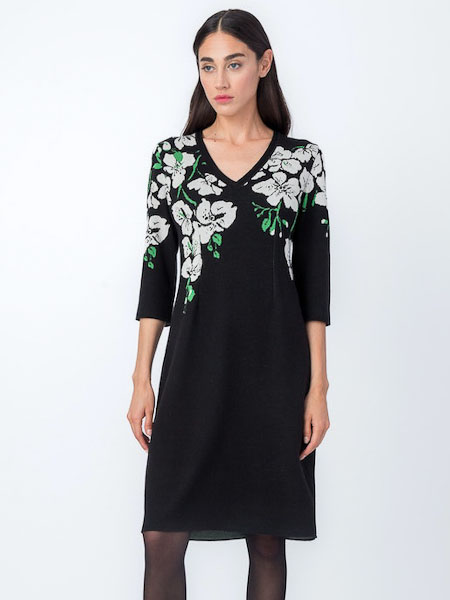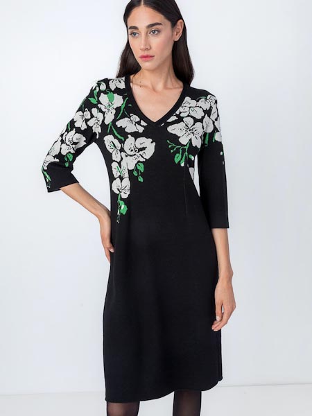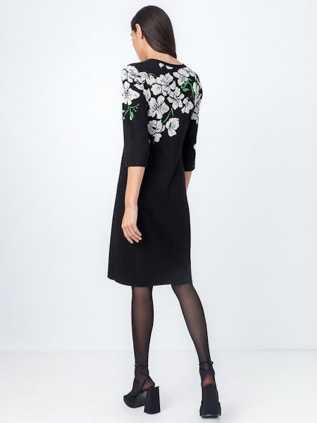 ist die Grundfarbe dieses bequemen und eleganten Strickkleides von Ivko, mit Orchideen im Blumenmuster im Jacquardmuster in den Farben wollweiß und oliv grün. Die Ärmel sind 3/4 lang. Das schicke Kleid ist tailliert, zum Saum hin gerade geschnitten. Die Ausschnittkanten des V-Ausschnittes sind im Strukturmuster gestrickt.Länge ca. 100 cm in Größe 38.