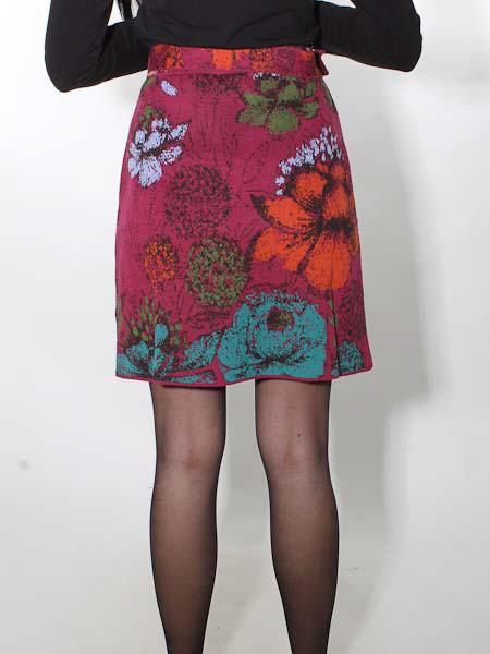 ist die Grundfarbe dieses schönen Strickrockes von Ivko, im Blumenmuster im Jacquardmuster in den Farben petrol, anthra, olivgrün, orange und hellblau. Er hat an der Taille einen breiten elastischen Strickbund, außen im Muster, innen in magenta uni gestrickt, dort ist ein Elasthanfaden mitgestrickt. Zum Rock gehört ein Strickgürtel mit einer Schnalle, die mit Strick bezogen ist. An den Seitennähten sind Gürtelschlaufen. Der Rock ist ausgestellt, bequem bei jeder Bewegung. Länge incl. Bundca. 53 cm in Größe 38.