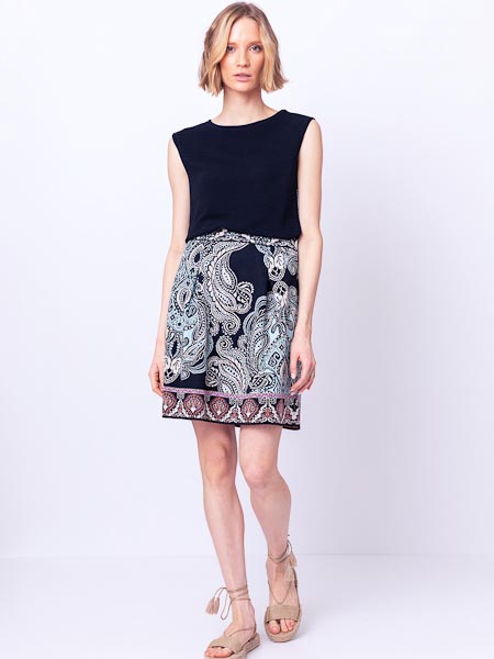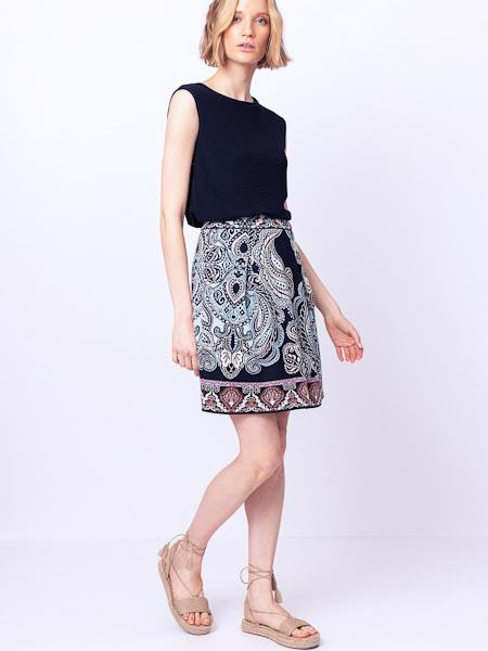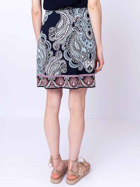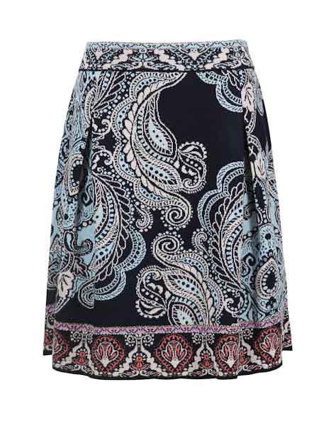ist dieser Strickrock von Ivko, im Jacquardmuster im Mustermix, orientalische Muster Paisleys und Bordürenmuster, gestrickt in den Farben dunkelblau wollweiß hellblau und in der Bordüre am Saum ein wenig flieder, orange und limone.