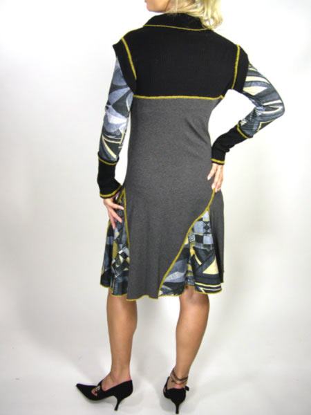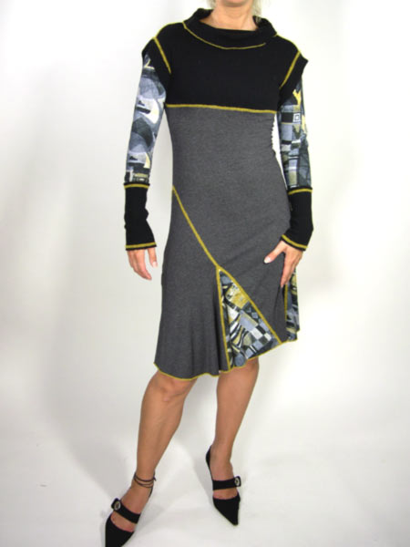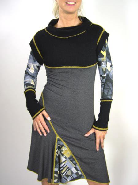 Superschickes Kleid für den Herbst von Kali Orea im Material- und Mustermix, aus bedrucktem Shirtstoff, grauem Shirtstoff und schwarzem Rippenstrick. Viele Kanten sind mit honiggelbem Kettelstich betont. Angenehm ist der weichfallende Kragen aus Rippenstrick. Das Kleid ist leicht tailliert, zum Saum hin ausgestellt, mit Godetfalten. Länge des Kleides Ca. 113 cm.