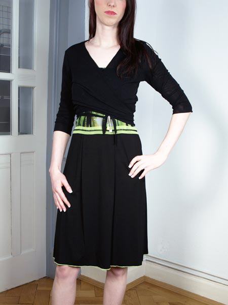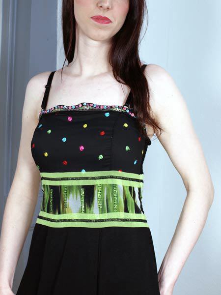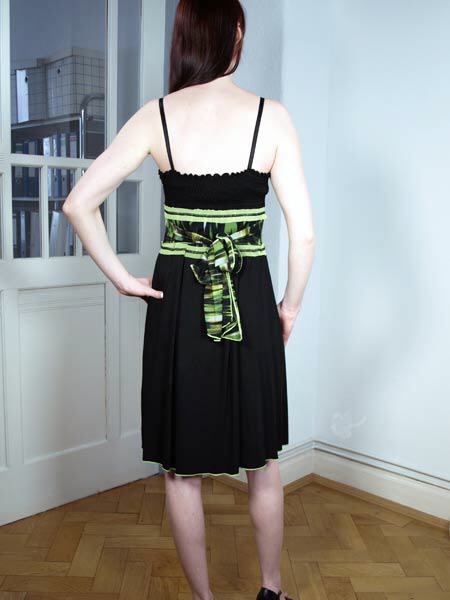 an den Seitennähten sind die Bänder für den Gürtel bei diesem sommerlichen Kleid von Kali Orea. Die Träger sind in der Länge verstellbar. Das Kleid ist verschlusslos, hat am Oberteil eine gesmokte Passe, damit ist das Kleid superbequem und sexy tailliert, zum Saum hin ausgestellt. Die Ausschnittkanten sind verziert mit einer Spitzenborte, auf der viele kleine, bunte Pailletten appliziert sind. Auch auf dem Miederteil blinken kleine grüne Steinchen. Länge des Kleides ca. 95 cm. Für kühle Sommerabende haben wir passend zu diesem Kleid eine leicht transparente Wickeljacke.