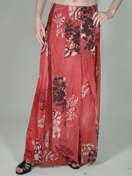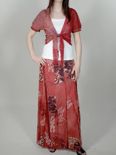 gearbeitet ist dieser lange Sommerrock von Kali Orea, aus 3 verschiedenen Stoffen zusammengesetzt. Der Rock ist am Vorderteil in Streifen übereinandergelagert, am Rückenteil ist er aus bedrucktem Netzstoff. Er ist gefüttert, Länge ca. 105 cm. Passend dazu haben wir eine kleine Bolerojacke zum Binden.