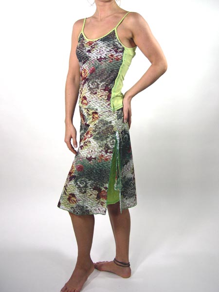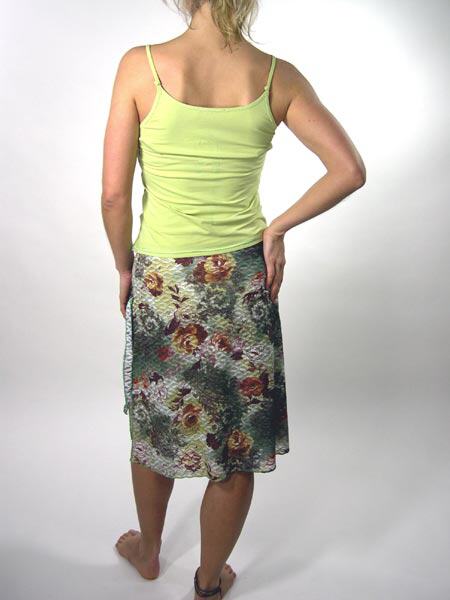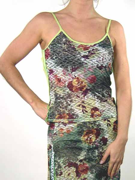 Mit Blumen und Blättern ist der reliefartige, stretchige Netzstoff des Vorderteils dieses Tops von Kali Orea bedruckt, das Rückenteil, die Spaghettiträger und die Blenden sind uni apfelgrün. Länge des Tops ca. 56 cm.