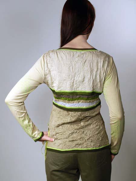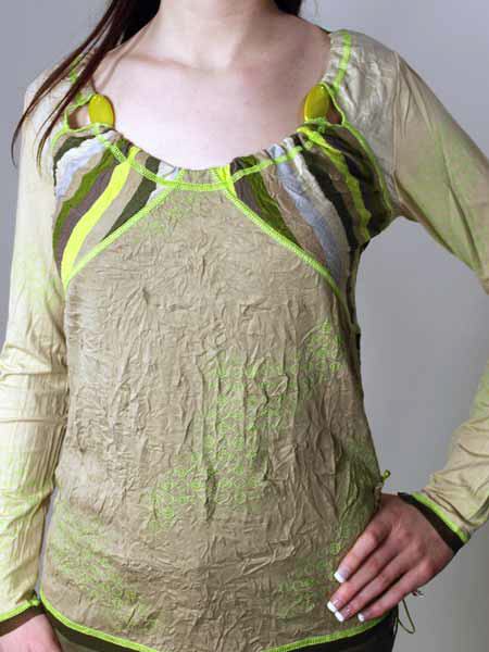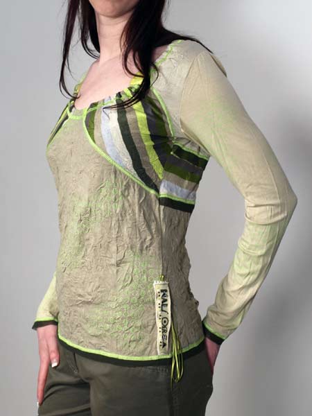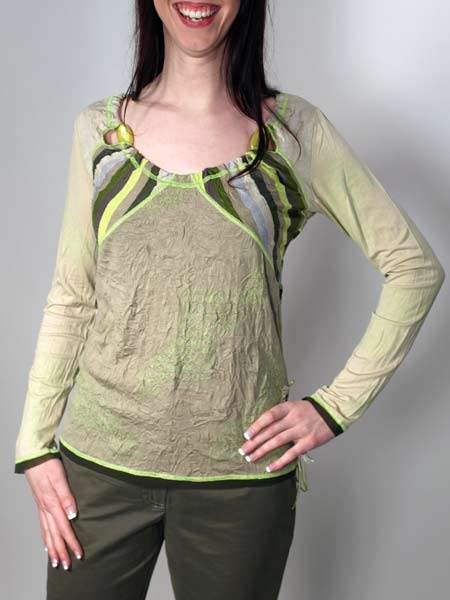 ist der Stoff dieses tollen Shirts von Kali Orea, in verschiedenen Grüntönen, uni und gestreift. Auffällig ist die Ausschnittlösung, durch die Kante ist ein Gummiband gezogen, mit 2 grossen aufgefädelten Steinen, darunter blitzt ein wenig Haut hervor. Die Saumkanten sind mit apfelgrünen Kettelnähten und einer dunkelgrünen transparenten Netzstoffkante betont. An der rechten Seitennaht ist ein Band mit dem bestickten Logo Kali Orea appliziert. Länge des Shirts ca. 63 cm.