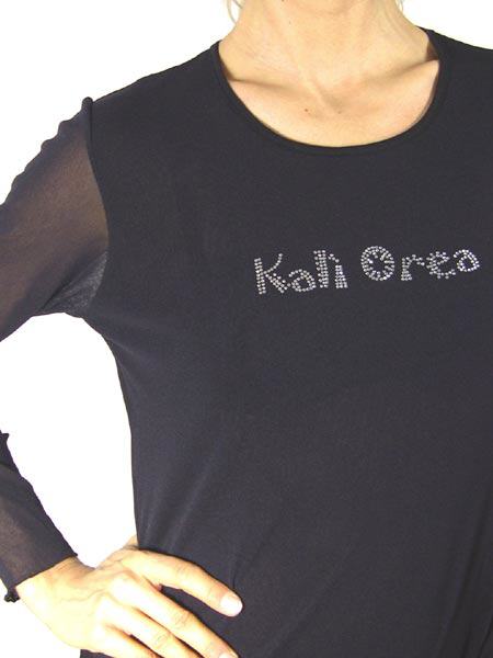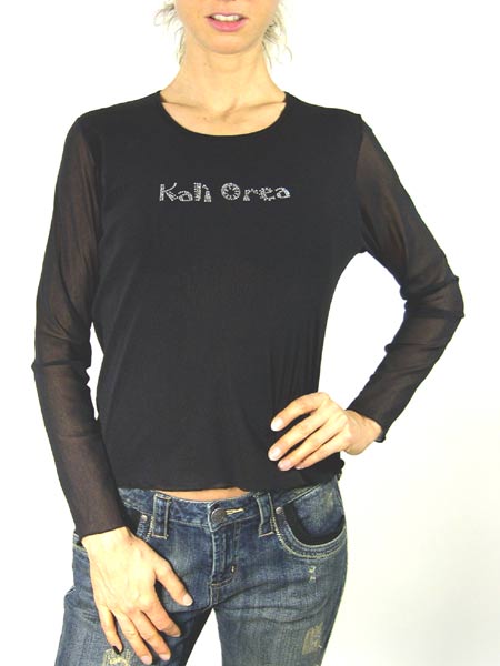 bilden den Schriftzug Kali Orea auf dem Vorderteil dieses schwarzen Shirts. Die Ärmel sind transparent, Vorder- und Rückenteil blickdicht. Wenn Sie das Shirt körperbetont tragen wollen, sollten Sie eine Größer kleiner wählen, das Shirt fällt gross aus.