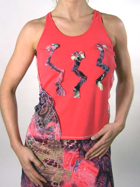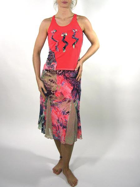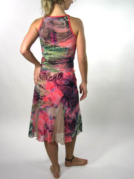 sind die Kringel auf dem Vorderteil dieses süßen Tops von Kali Orea, das Rückenteil und die Bänder sind aus leicht transparentem Netzstoff, verwaschen bedruckt. Länge des Tops ca. 52 cm. Passend dazu haben wir einen Rock, zusammen ein schickes Sommerkleid.