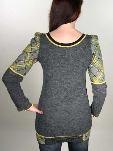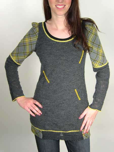 sind die Ärmel an dieser topmodischen Tunika von Kali Orea, aus einem federleichten Gestrick und einem Karostoff. Die Nähte sind betont mit Kettelnähten in honiggelb. Vorder- und Rückenteil sind gefüttert, so dass das Gestrick auch bei empfindlicher Haut nicht kratzt. Länge der Tunika ca. 78 cm.