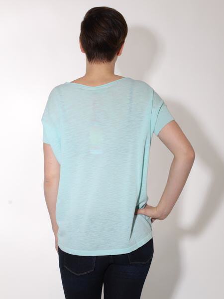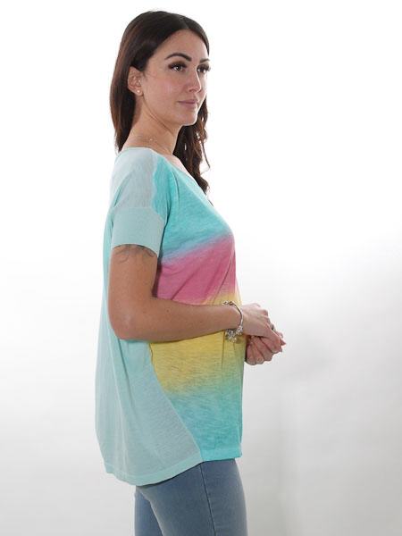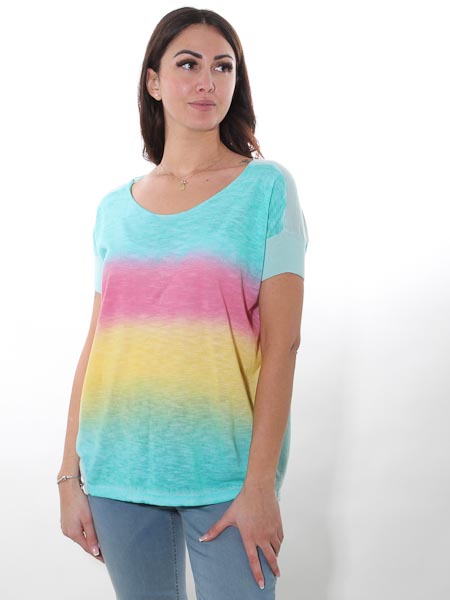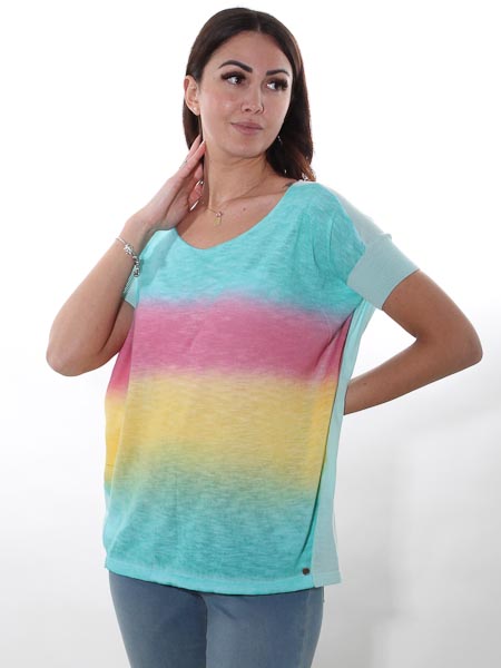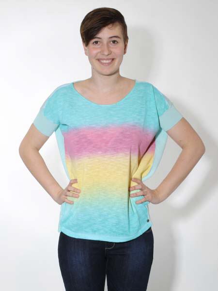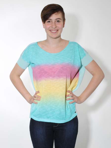 gestrickt ist dieser lässige Baumwollpulli von Kooi, Natur pur, am Vorderteil im Farbverlauf von türkis zu apfelgrün, zu gelb, zu pink hin zu türkis. Das Rückenteil und die Ärmelbündchen sind uni mint. Der Pulli ist am Oberteil modisch weit und überschnitten, zum Saum hin schmal. Länge am Rückenteil ca. 70 cm, am Vorderteil ca. 67 cm.