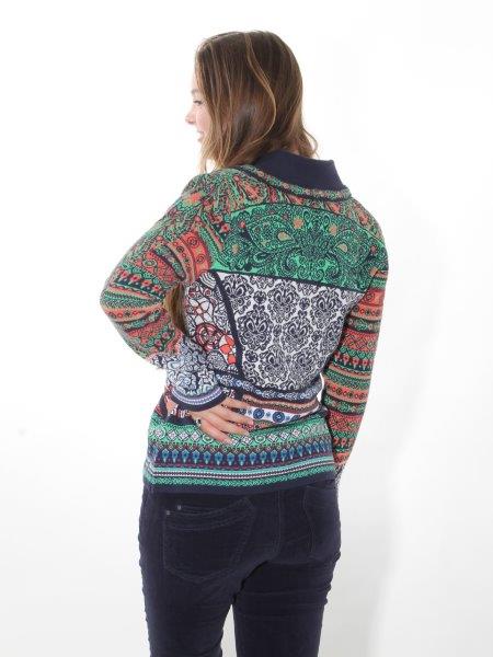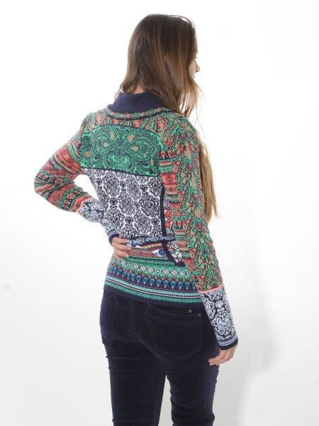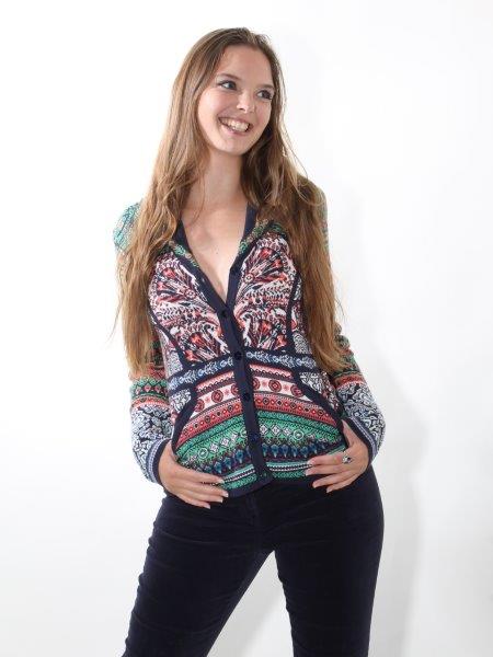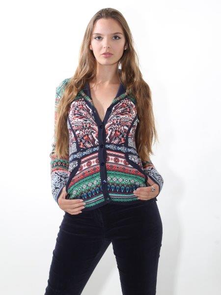 ist dieser farbenfrohe Strickblazer von Kooi, im Jacquardmuster gestrickt im Mustermix, in dunkelblau mit königsblau, orange, grün, wollweiß. Die Strickjacke hat einen Reverskragen, ist vorn durchgeknöpft. Sie hat 2 Eingrifftaschen. Die Baumwolle ist ideal für alle, die keine Wolle vertragen, ganz weich auf der Haut.